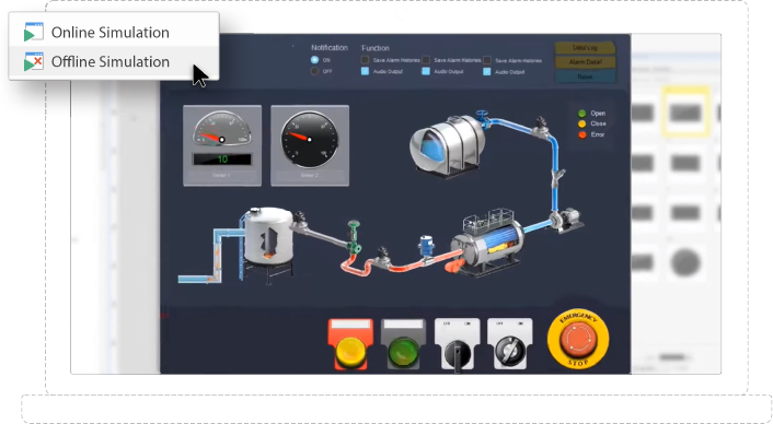 提供彈性的程式模擬選擇,即使沒有實體HMI,也能先確認設備通訊能力,并預覽程式的運行結果。