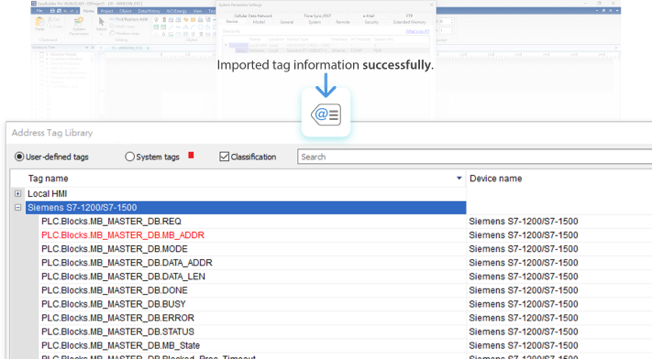 將PLC原廠軟體輸出的地址資訊檔案匯入EasyBuilder Pro,即可自動完成設備地址列表的建立,大幅簡化將PLC地址整合至HMI的過程。