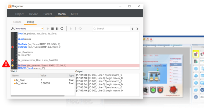 HMI軟體除錯工具,透過監視數據、通訊狀態,與巨集程式碼除錯,透視設備運作,加速開發流程。