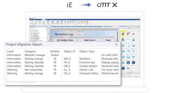 舊機升級只需修改HMI型號,由EasyBuilder Pro自動進行大部分功能轉換,并提供升級報告及修改指引,用戶無須重新設計HMI畫面,實現無縫轉換。